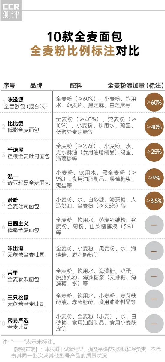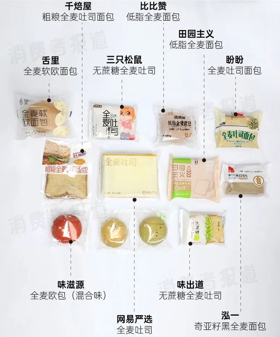 味出道、舌里、田园主义、三只松鼠和网易严选等5款面包则未标注全麦粉的比例,这给消费者的选购带来不少困扰。
