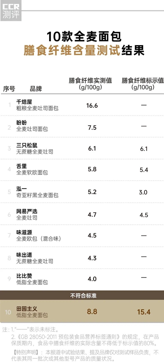 10款全麦面包测试:田园主义“又”不达标,过半面包全麦粉添加量成疑