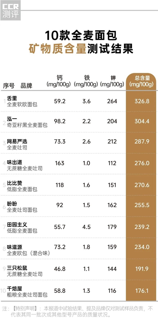 检测结果显示,10款全麦面包均含有钙、铁、钾等3种矿物质元素,矿物质元素总量最高的是舌里(326.8mg/100g),最低的是千焙屋(176.1mg/100g),前者几乎为后者2倍。