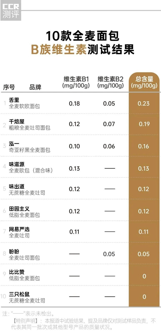 1、只有千焙屋、盼盼、比比赞、泓一、味滋源等5款面包标示了全麦粉的添加量,其余6款均未标示。这将给消费者的选购造成不少困扰。