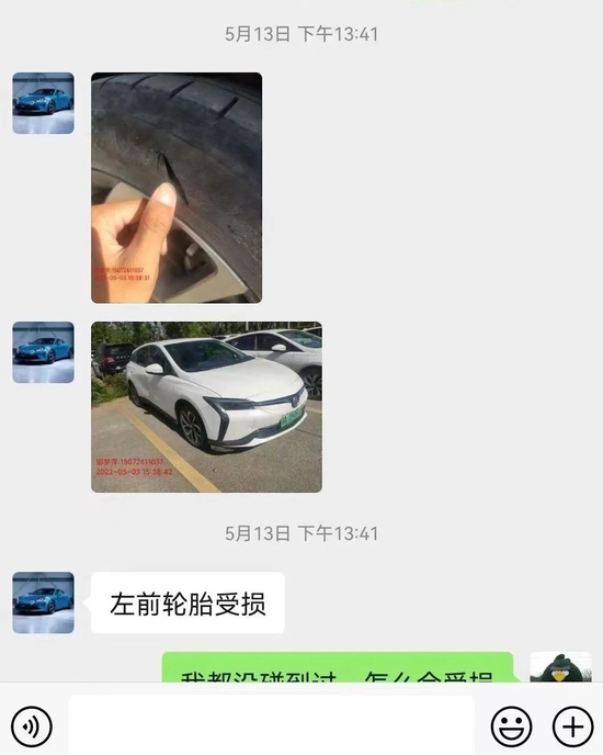 “5月13日中午,我收到短信提醒,说我有一个维修订单超过7天没支付。”高先生表示,收到短信当天,联系租车公司后客服发给他一张车辆右侧车身全貌以及一张轮胎局部破损照片。照片显示,轮胎侧面大约有一道4厘米长破口,对方告诉他,车辆左前轮受损。