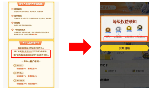 认养一头牛官方也已从去年开始关闭分销模式。《消费者报道》查看其微信公众号页对话窗口发现,菜单栏中的“招·当合伙人”和“玩·养牛游戏”入口已经删去。最新的养牛人评级标准也已更改,从原来的累计推广销售金额变为累计消费金额。