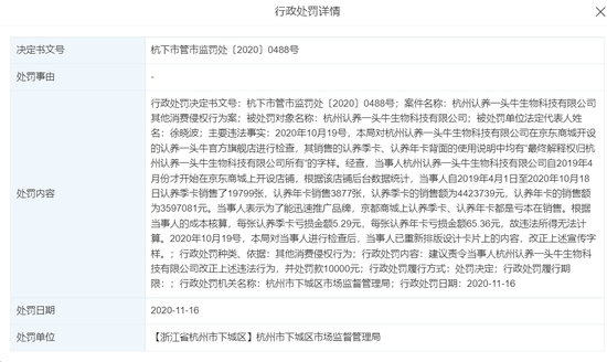 值得注意的是,根据天眼查公开信息,2020年11月,杭州认养一头牛生物科技有限公司曾因销售的认养季卡、认养年卡背面的使用说明中均有“最终解释权归杭州认养一头牛生物科技有限公司所有”的字样而被杭州市下城区市场监督管理局处以一万元罚款。