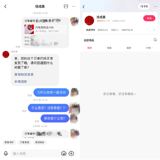 家住北京的王女士对记者投诉称,自己今年1月在徐成晨的直播间购买了一副手镯,花费199元。但是过了很久都没有收到商品。