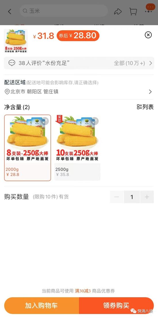 小八在东方甄选直播间看到,引起争论的“东方甄选黄糯玉米”价格为47.9元一箱,8根/箱(1.6kg),平均每根玉米约5.98元,的确将近6元一根。在淘宝平台,“海农壹品旗舰店”的黄糯玉米28.8元/8根(2000g),平均每根3.6元;“邹有才旗舰店”的黄糯玉米29.9元/8根(1760g),每根约3.7元。