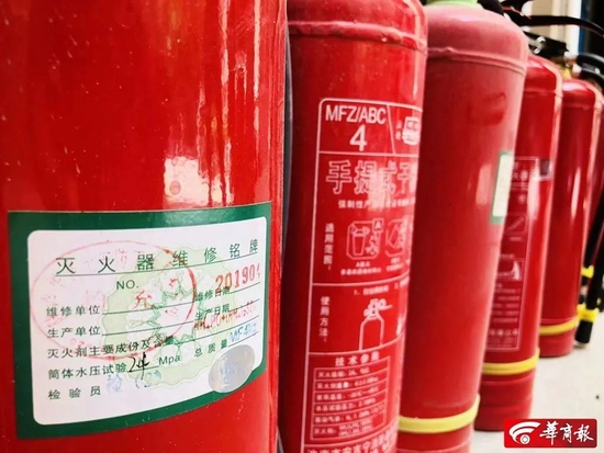 6月20日,华商报记者来到颐和郡小区看到,多个楼下都堆放有灭火器,6号、7号楼下分别放置了66个手提式干粉灭火器。记者随机走访楼层,在楼梯间,有的消火栓箱玻璃门上可以看到残留的封条痕迹,有“西安仲瑞物业2017年4月封”字样,灭火器已不见,有的上层消火栓箱玻璃门也被打开,水带被打散。其中一处消防月检表上次检查日期是5月25日。在5号楼,消火栓箱里灭火器还在,封条已被撕掉。而不管是楼下堆放的灭火器,还是留在楼内的灭火器,维修铭牌均显示日期为2019年4月,生产日期空白。