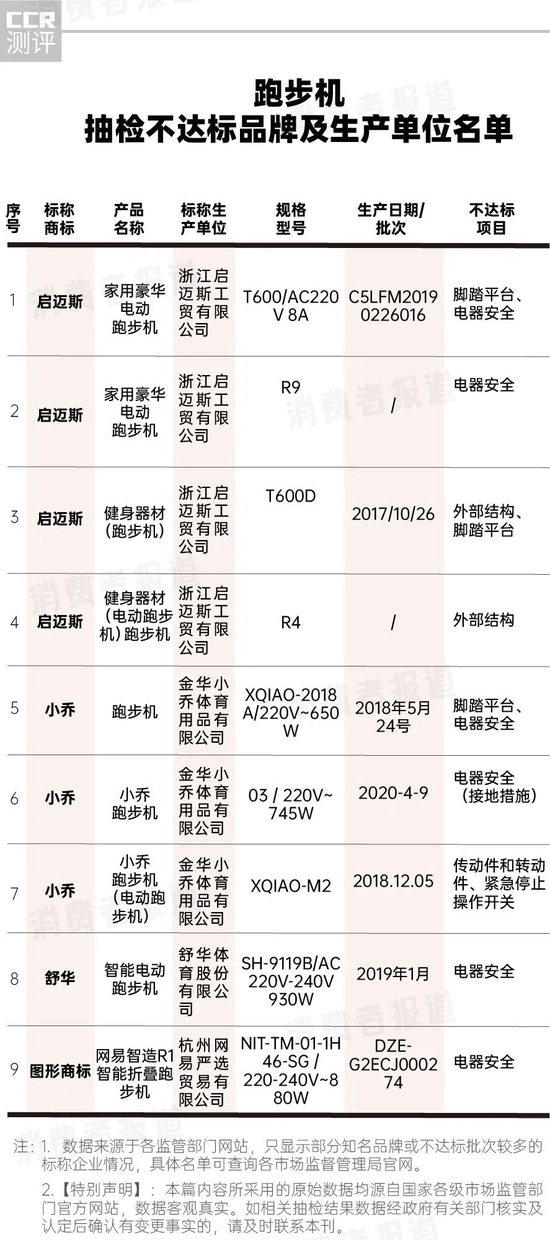此次检测中,跑步机是检测不达标最严重的健身装备,76批次不达标,涉及舒华、启迈斯、小乔、网易严选等。