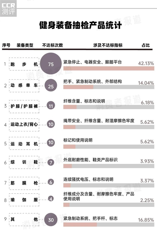 结果显示,国家、省市级监管部门共抽检发现178批次健身装备不达标,涉及跑步机、动感单车、护膝、运动服、瑜伽服、运动耳机、综训鞋、筋膜枪等,鸿星尔克、乔丹、361°、网易严选等大品牌上“不达标黑榜”。