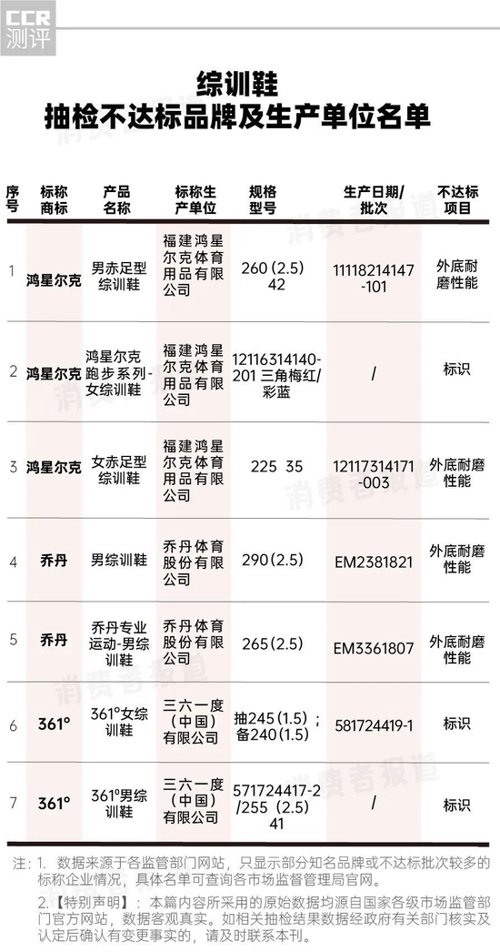 此次检测中,7批次综训鞋被检出不达标,涉及鸿星尔克、乔丹、361°等大品牌。