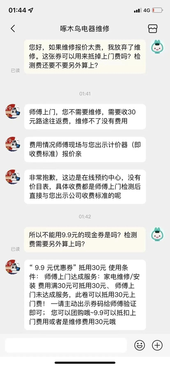 对此,记者针对赵宇的情况咨询了啄木鸟电器维修的官方客服。客服表示,师傅上门,若用户不需要维修,需要支付30元路途往返费用(上门费),并表示“9.9元优惠券”可以用于抵扣上门费。