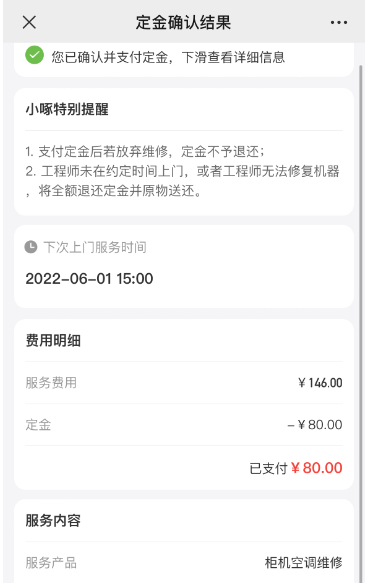 而赵宇提供的支付截图显示,其缴纳了80元,费用明细标明为定金。这让赵宇很是不解,“他也没给我修什么,就给我室外机那壳拆了,告诉我主板有问题,这样就收了我80块钱,我觉得这钱有点瞎收。”