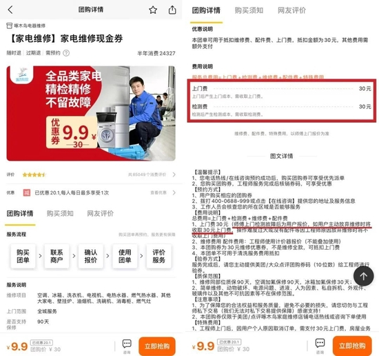 值得一提的是,记者通过美团平台上搜索“9.9元家电维修现金券”时发现,其详情页面写着上门费用为30元,并规定若用户主动放弃维修时将收取30元的上门费用。
