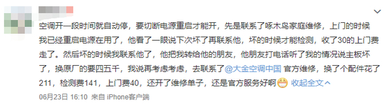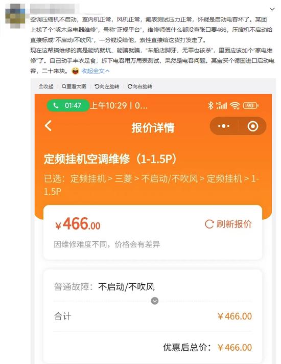 除了防水补漏以外,家电维修也是啄木鸟的热门服务之一。“我家的海尔空调主板坏了,就在美团找到他们家,标价上门检查9.9元。”来自天津的赵宇(化名)告诉《消费者报道》记者,因担心官方售后维修费用更高,于是在美团上找了啄木鸟家庭维修。