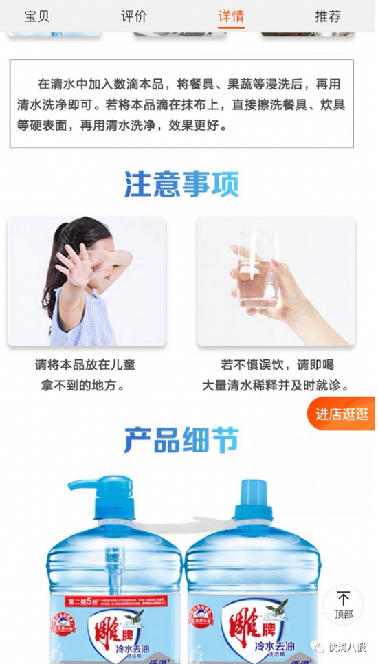 该洗洁精产品详情介绍的注意事项提示,产品需放在儿童拿不到的地方,不慎误饮需及时就诊。