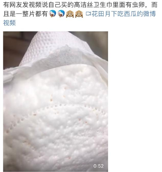 当时,有不止一名网友,在高洁丝的卫生巾内,发现了疑似虫卵的黑色点状物,并将视频传到了网上。视频中,洁白的卫生巾上,那些肉眼可见的斑斑点点,一下子点燃了大众的情绪。