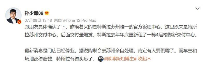 另据一名认证为汽车博主的大V称,已确认着火的是特斯拉苏州唯一的官方钣喷中心,此处原先是特斯拉交付中心。他还表示,特斯拉全球副总裁陶琳可能将亲自前往处理,特斯拉需要赔偿车主和场地的损失,损失比较严重。