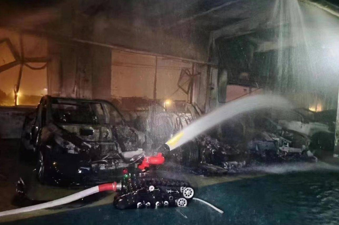 消防人员已经赶到并控制火势,但现场仍有较浓的白烟,同时灭火机器人正在作业。