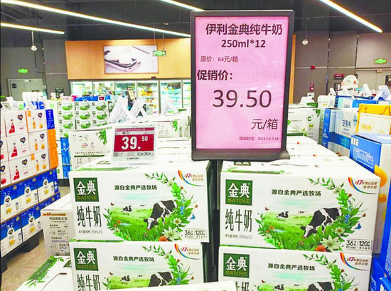 7月23日下午4时20分,记者在华润万家 MART 双港西大街店内看到,一款名为“伊利金典纯牛奶”(250ml×12)的商品正在促销,原价 64 元/箱,促销价为39.5元/箱,价格牌上的活动时间为7月6日至7月19日。同时,记者还看到,该款商品上面还放着另一个较小的价格牌,虽然产品品名、促销价一致,但是原价为40.71 元/箱,促销时间为 7 月 20日至8月2日。这款商品到底以哪个价格牌为准,原价是64元/箱还是 40.71 元/箱?为何两次促销价格一致,促销时间要分开写?