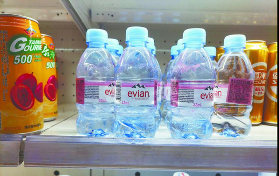 7 月 22 日晚 9 时,在王府井首航超市,记者发现一款名为“依云天然矿泉水(330ml)”的商品未标注价格。