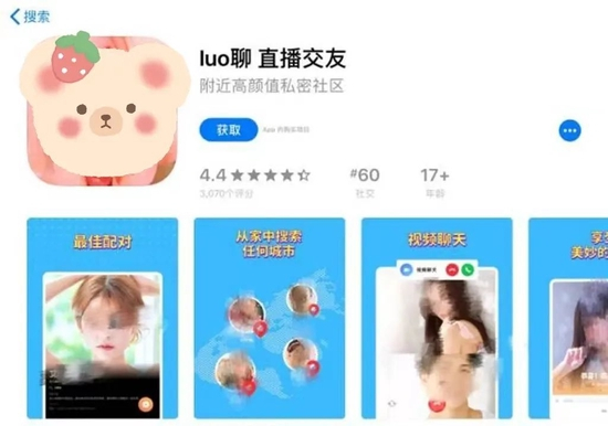 比如,苹果应用商店中,一款App名叫“luo聊直播交友”,不仅名字起的耐人寻味,图标也非常羞耻。