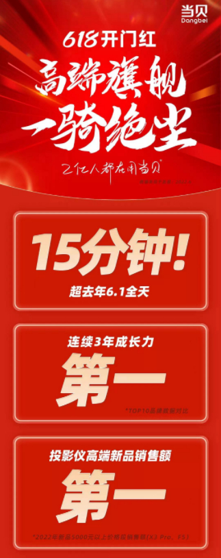 而在不久前的618年中大促中,当贝投影仪销售成绩亮眼。销售战报显示,其获得多个第一,即连续3年品牌成长力第一、X3系列斩获激光投影销售额第一、X3 Pro&F5斩获高端投影仪新品销售第一、当贝超级盒子MAX 1斩获高端盒子销售额第一、电视盒子销售额斩获全网第一、抖音投影仪带货榜第一。