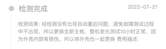 经过一番维修后,7月24日,丸子收到了修好的新机,维修方式依旧是更换主板和外壳。检测结果显示,“经检测没有出现自动重启问题,避免故障测试过程中不出现,所以更换全新主板,整机老化测试10小时正常,因为外壳内部有损伤,所以将外壳也一起更换。”