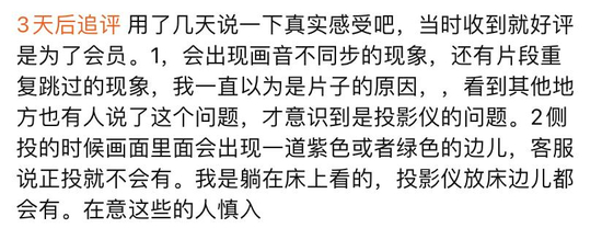 但荒谬的是,丸子发现,即使换新再次维修后,自动重启问题依旧未解决,“对于一部一小时四十七分的电影,投影仪重启了三次”她表示。