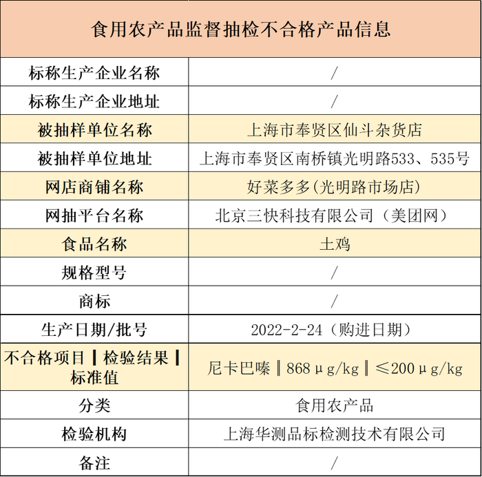 近日,上海市市场监管局发布2022年第22期省级食品安全抽检信息。本次抽检4大类食品156批次样品,检出不合格1批次。不合格样品为:好菜多多(光明路市场店)(经营者为上海市奉贤区仙斗杂货店)在美团网上销售的土鸡(不合格项目:尼卡巴嗪)。