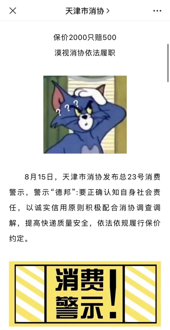 8月15日,天津市消协喊话德邦快递:要正确认知社会责任,配合调查,履行保价约定。
