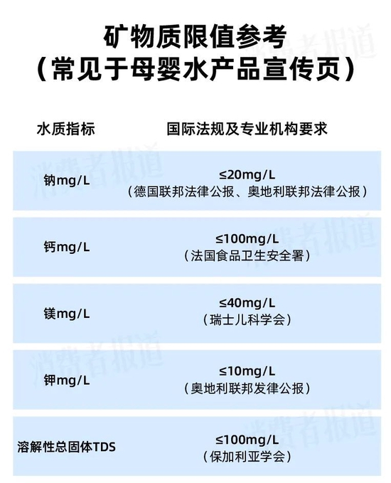 饮料营销从业者李强向记者透露,很多父母都想给孩子喝上放心的水,商家为了更好卖,价钱卖得更高,往往给矿泉水贴上“母婴水”“适合婴幼儿”的标签。他们的宣传文案也是大同小异。根据他的说法,记者确实在各品牌母婴水的宣传页面留意到相似的文案,以及相同的一些国外机构如法国食品卫生安全署、瑞士儿科学会等,给出的儿童饮用水矿物元素限量值参考。