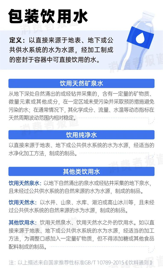 根据国家标准GB/T 10789-2015《饮料通则》的规定,包装饮用水主要有三个大类,分别是饮用天然矿泉水、饮用纯净水和其他类饮用水。但无论是大类还是小类,都没有“婴儿水”“母婴水”这个类别。