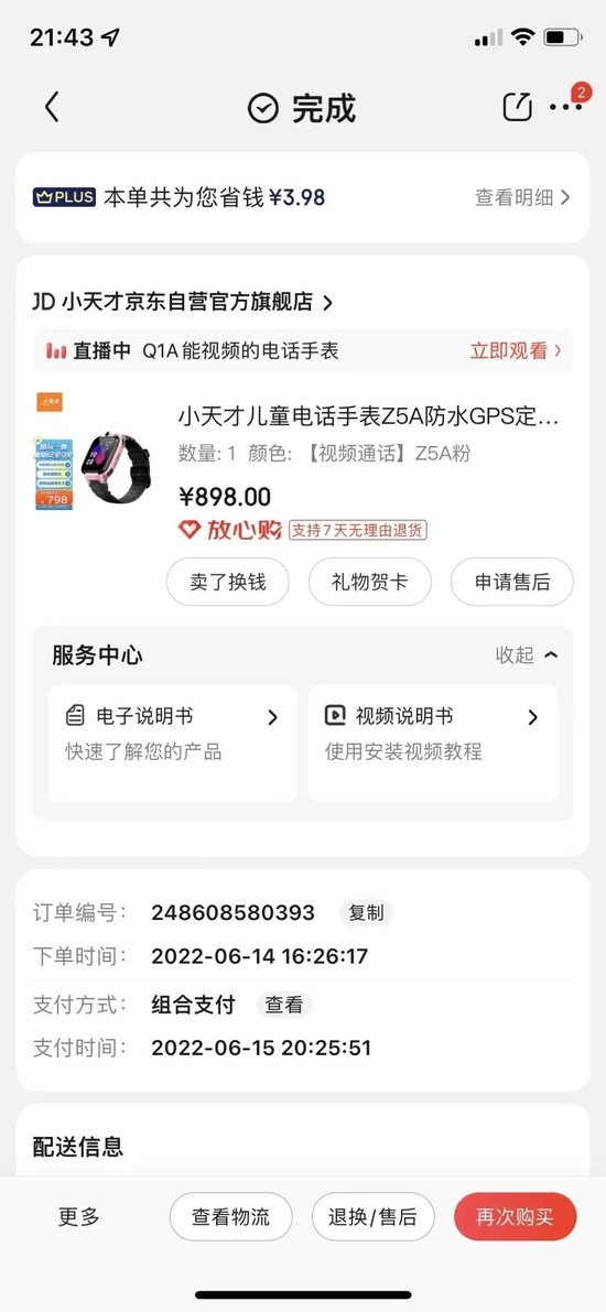 值得注意的是,《消费者报道》在各大电商平台的小天才官方旗舰店查询,均未找到Z5A型号的手表。随后本刊以普通消费者的身份询问店铺客服得知,Z5A是2019年上架的产品,目前缺货下架了,并已经停产,不会重新上架。该名客服人员同时向本刊推荐了小天才D3电话手表,并称与Z5A差不多,是2021年上市的一款支持视频通话和拍照的4G电话手表。