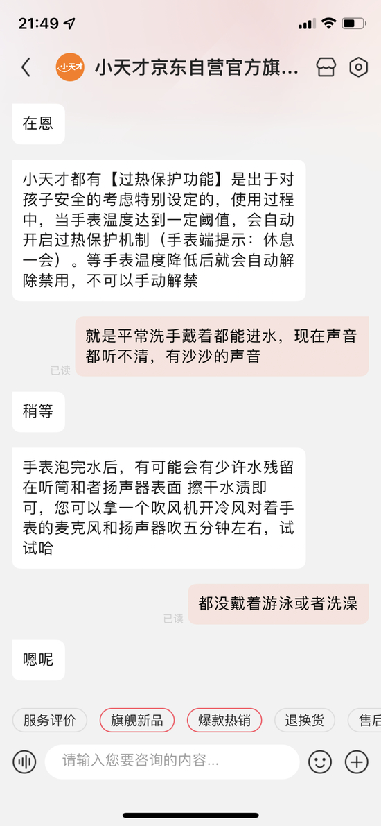 对于防水能力差,该名客服表示,“手表泡完水后,有可能会有少许水残留,在听筒或者扬声器表面擦干水渍即可,可以拿一个吹风机开冷风对着手表的麦克风和扬声器吹五分钟左右试试”。
