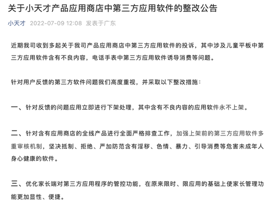 针对不断扩散发酵的舆论,小天才7月9日回应称,对相关软件立即进行下架处理,含有不良内容的应用软件永不上架,并进行全面严格排查工作,加强年龄段适用软件的分类标准。