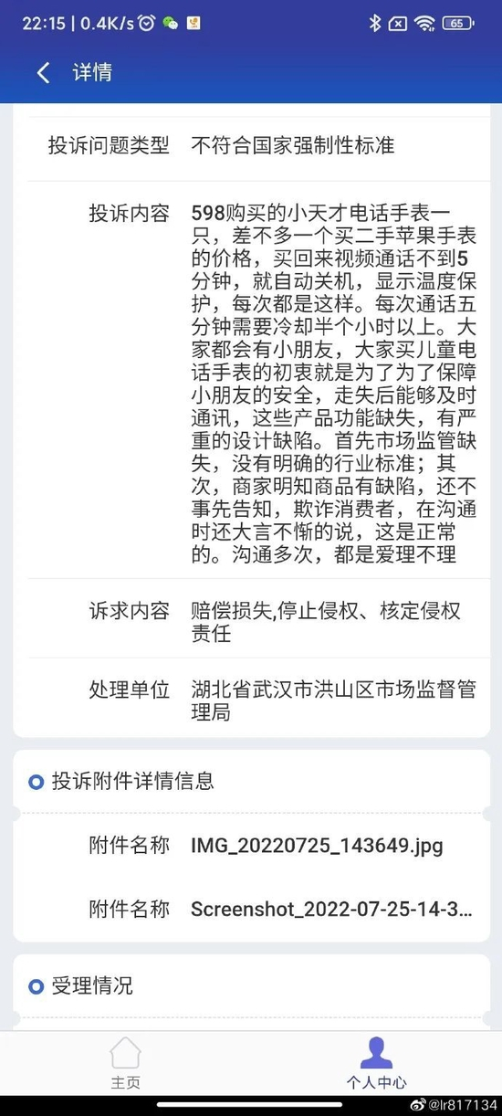 有消费者在微博上反映,其花费598元购买的小天才电话手表每次视频通话不到5分钟就会自动关机,且需要冷却半小时以上。而向12315app投诉反馈时,则被相关部门告知“问题属于正常范围内”。