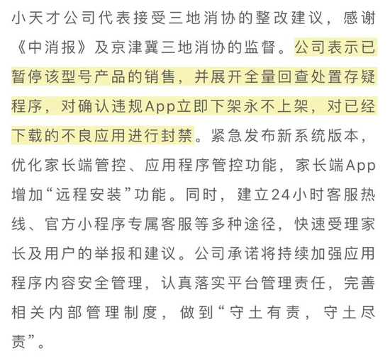 7月18日,北京市、天津市、河北省三地的消费者协会联合约谈了广东小天才科技有限公司,分别就应用商店如何进行安全检查等相关问题对小天才公司进行了询问,并向小天才公司发出《查询函》,要求其在7月28日前作出答复。