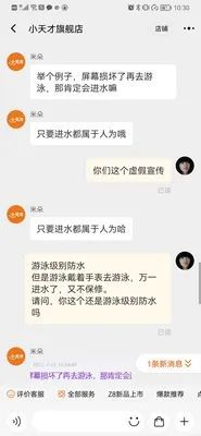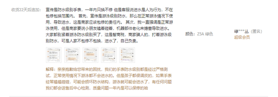 而有客服回复该名消费者的评论时解释称,“我们的手表防水级别都是经过严格测试,正常使用情况下游泳都不会进水的。但是孩子都很调皮的,如果手表经常磕磕碰碰,可能会损坏防水结构,游泳就可能会进水了。”