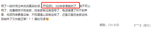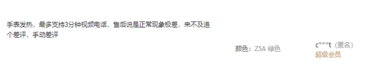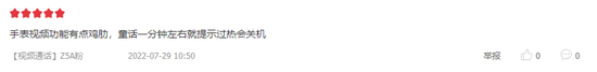 值得关注的是,不止一位消费者反映小天才Z5A电话手表存在质量问题。《消费者报道》在社交平台、投诉平台检索发现,不少消费者也在吐槽该款手表,问题主要集中在续航差、视频通话发热被中断等核心功能的问题上。