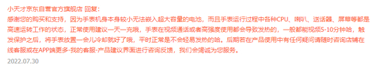 《消费者报道》注意到客服曾在评论中回复消费者称,“因为该款手表机身本身较小无法嵌入超大容量的电池,而且手表运行过程中各种CPU、喇叭、送话器、屏幕等都是高速运转工作的状态,正常使用建议一天一充。”