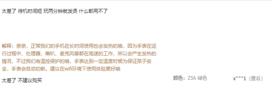 然而,周女士没有想到,小天才Z5A电话手表在使用过程中存在不少问题。周女士称,手表续航很差,小孩没怎么玩,放一天就没电了。而且反应迟钝,触屏很久后才有反应。