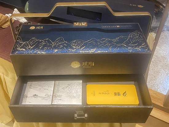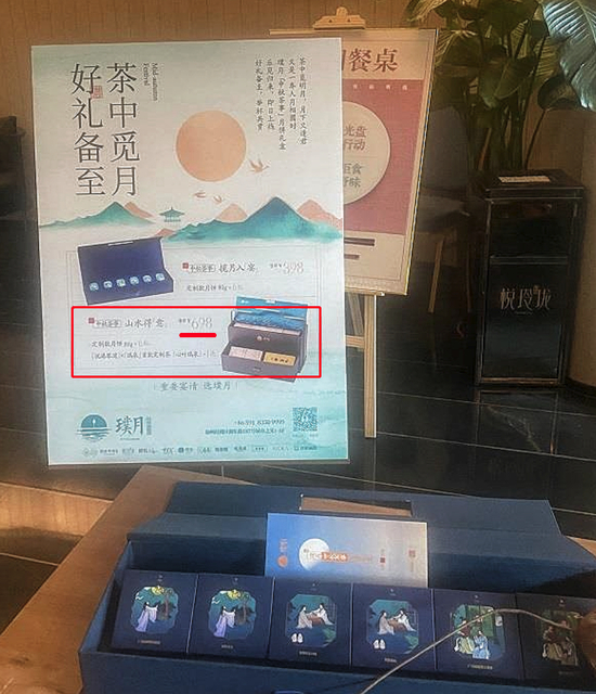 服务人员声称“山水得意款”售价698元/盒,并说盒中所送那泡茶很贵。另一款“揽月入宴款”月饼礼盒售价398元/盒。