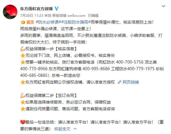 伴随着雨季的到来,网上越来越多消费者发布了关于“注胶防水骗局”的经历。7月28日,东方雨虹官方微博发布“注胶防水骗局”提示,无论线下门店、网上店铺,必看授权书,核实身份。