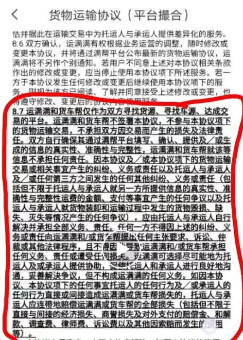 记者在刘先生提供的货物运输协议(平台撮合)中看到,运满满仅作为双方寻找货源、寻找车辆、达成交易的平台,不签署该协议,运满满平台不对托运人和承运人信息的真实性承担任何责任,若双方因运费的金额、支付等事宜产生纠纷,任何一方不得因上述的纠纷向运满满平台提出任何主张要求、诉讼、仲裁等。