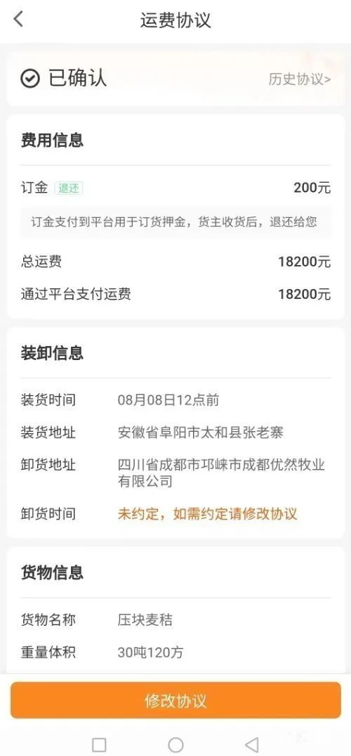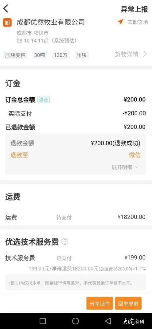 刘先生开的是长为17.5米的平板货车、8月7日,他在运满满平台接到一单运送压块麦秸的运输单,发单人姓彭,麦秸体积是30吨120方,装货时间是8月8日,装货地点在安徽省阜阳市太和县张老寨,卸货地点在四川省成都市邛崃市成都优然牧业有限公司。这趟货的运输时间预估为两天,路程是1400多公里,总运费是18200元。接单后,刘先生在运满满平台支付了订金200元,并支付给运满满平台技术服务费199元。8月10日,刘先生完成运输服务,运满满平台将刘先生事先支付的200元订金退还。