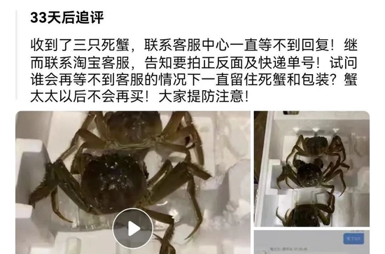 《中国消费者报》调查发现,随着生鲜冷链物流的完善,蟹卡蟹券越来越倾向于“线上预约,冷链快递”,且多数承诺“死蟹包赔”,如果配送的螃蟹是死的,消费者需要将死蟹和快递单拍照,一定时间内发送给客服,通过审核即可理赔。但《中国消费者报》在电商平台的评论区也看到,有消费者抱怨联系不上客服、客服回复慢,导致未能顺利索赔。
