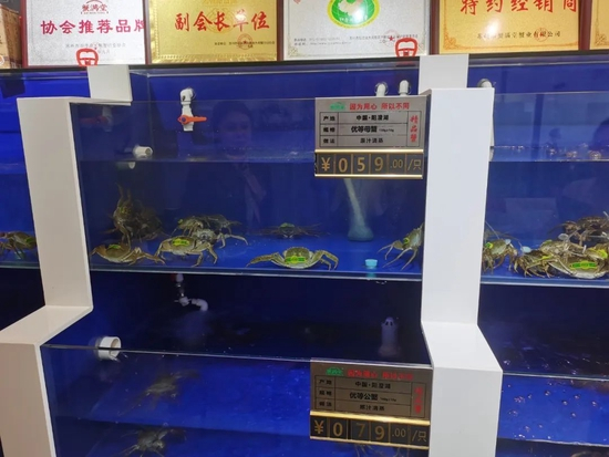 ▲线下门店养着鲜活的螃蟹。