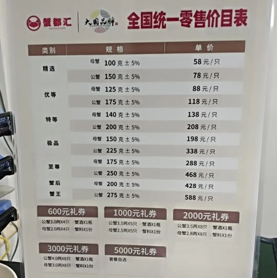 《中国消费者报》注意到,店员提供的“2022北京 蟹都汇高端大闸蟹价目表”中共有12种型号的蟹,最便宜的是798型,卡券售价798元一张,最贵的是3999型,卡券售价3999元一张。此外,“全国通用券”中也有600元礼券、1000元礼券、2000元礼券、3000元礼券和5000元礼券等五种类型。