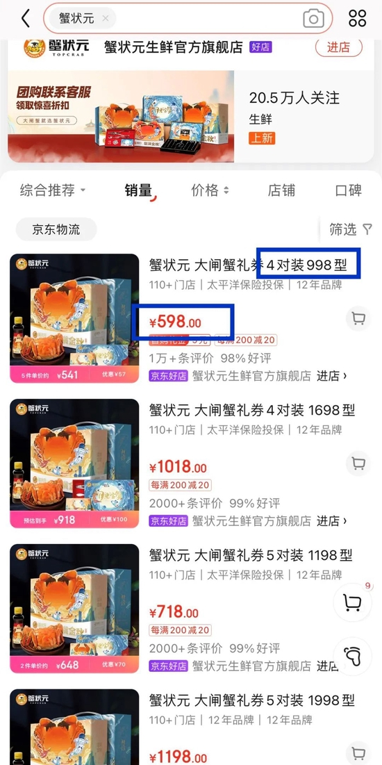 • 京东平台的“蟹状元生鲜官方旗舰店”标示价格为598元。
