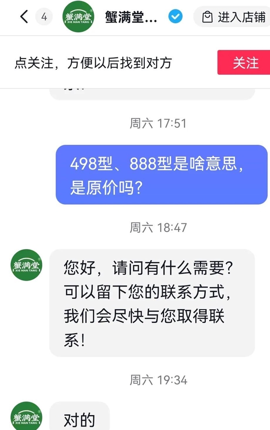 在短视频平台“蟹满堂官方旗舰店”,数字型号标列了相应价格,如498型的价格是368元,888型是666元,5888型是4488元。向客服询问“498型、888型是啥意思,是原价吗?”客服做出了肯定的回答。
