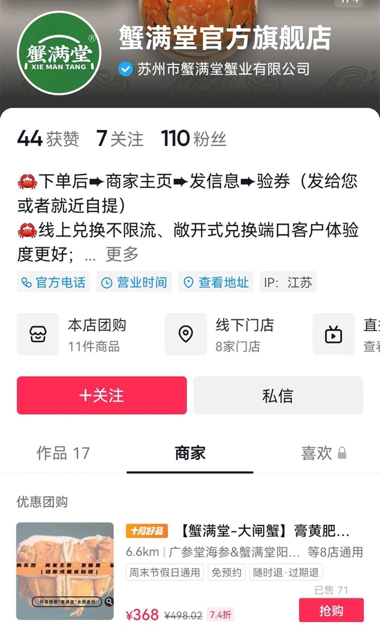▲在短视频平台上销售的“蟹满堂”大闸蟹产品。
